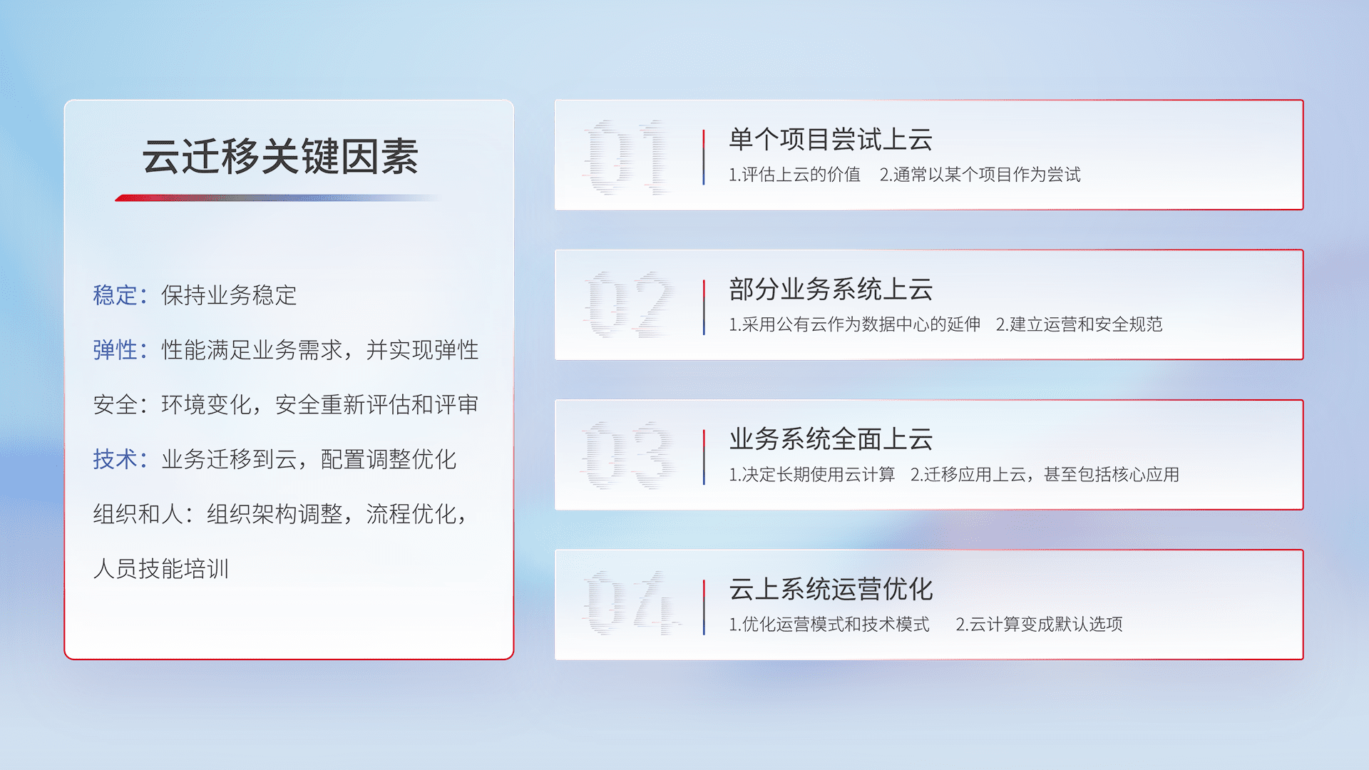结合实际业务,,,从规划设计、、、、云平台选型、、、云原生改造、、数据迁移、、、、集成交付,,迁移全过程为客户识别最佳上云路径,,,做好风险识别管理,,,设计网络架构、、、身份权限、、、安全审计合规、、、、操作审计、、、、日志审计、、、监控告警策略、、多站点容灾设计等,,,对云上基础设施进行整体规划,,,,提升IT治理水平,,,,以满足弹性、、、高可用、、、高性能的需求。。。
