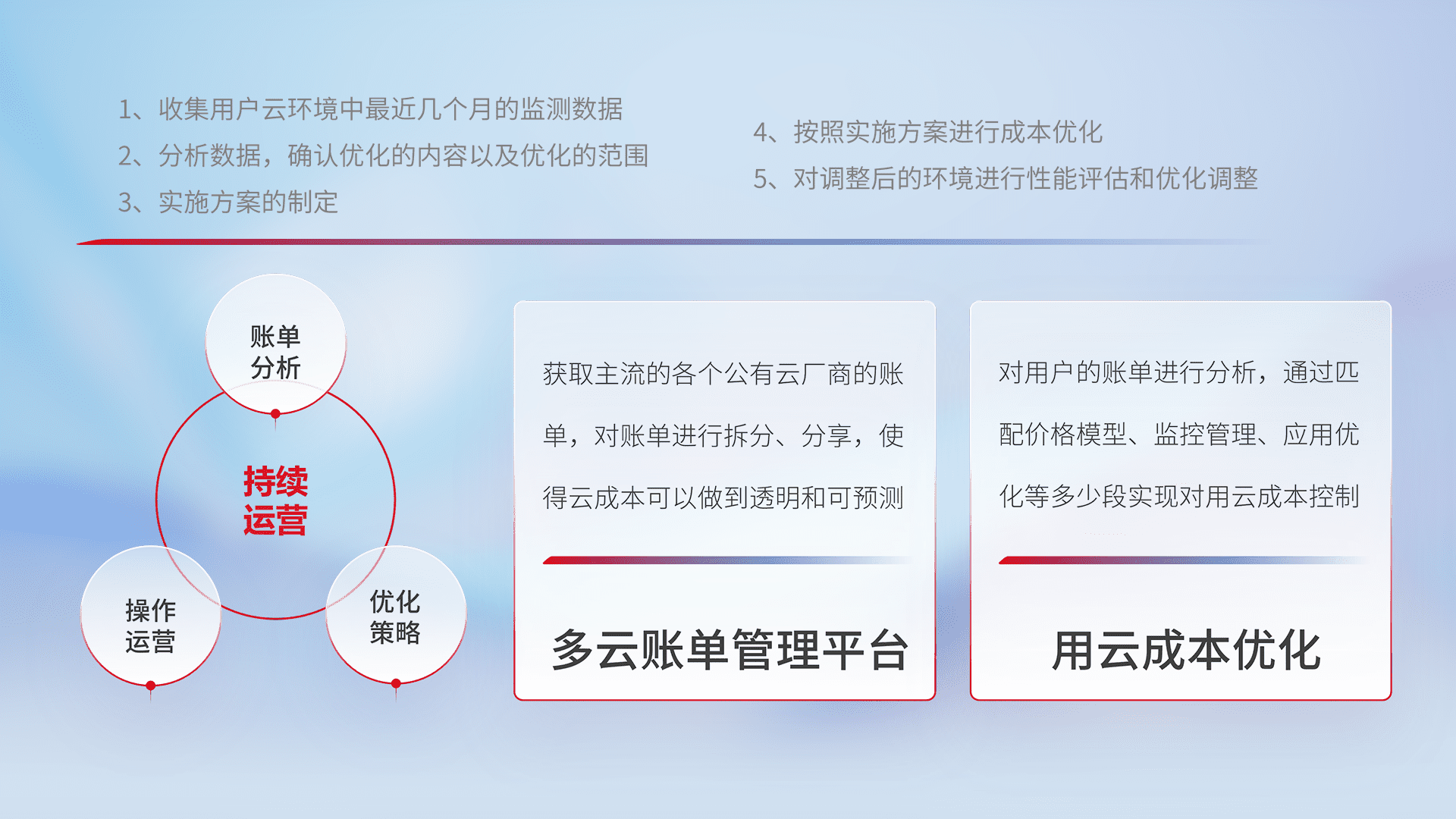 通过多云纳管,,,以统一的资源数据模型把客户的云资源进行抽象和封装,,,进而实现对多云资源的统一操作,,,,保障云资源管理的可靠性、、、、稳定性与可用性。。。。量身定制化运维内容,,配置、、、、开发运维、、、、补丁管理、、、备份、、、监控、、认证和访问管理、、、、审计和日常巡检等,,,保障在用云过程中的可靠度,,稳定度以及高可用率。。